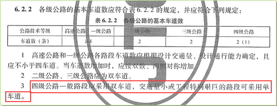 5)还有,请注意《规范》在第6.2.2的第3款,“四级公路一般路段应采用双车道,交通量小或......的路段可采用单车道”。如下图所示。因此,在对四级公路单车道断面(不设置右侧硬路肩)等特殊情况进行讨论时,应注意把握上面第3点提到的“一般性原则”。这样就避免陷入把某种特殊情况,当作普遍性问题去考量的思维局限之中了。
