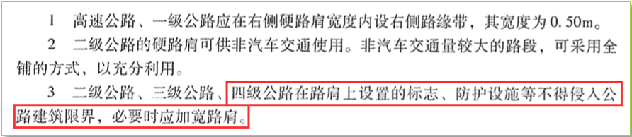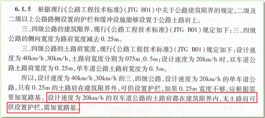 4)对于上述三、四级公路的情况,当土路肩宽度(如0.25m时)不能满足设置护栏等设施需要时,均需要对路基进行局部加宽。对应《规范》第6.4.1条第3款的规定,“二、三、四级公路在路肩上设置标志、防护设施时,...必要时应加宽路基”。如下图所示。同时,在按照上述理解、区分不同情况确定建筑限界之后,还应检查并确保路侧护栏等设施不应侵入建筑限界之内。