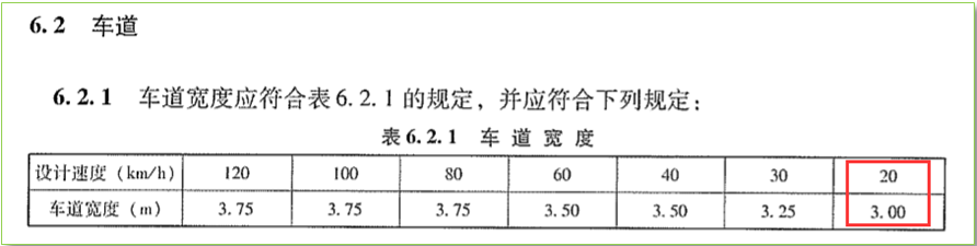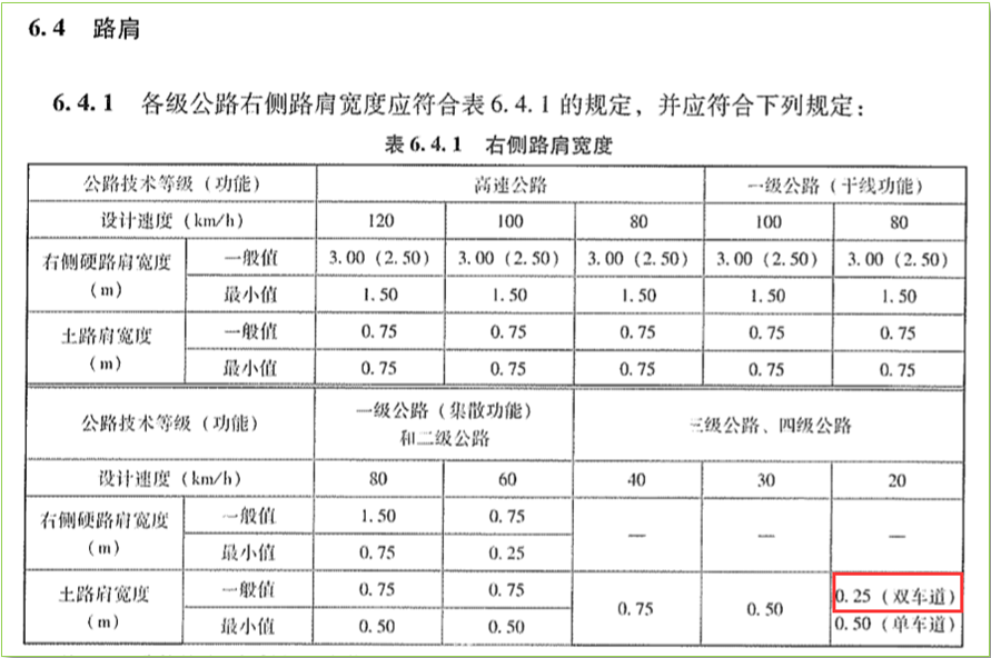 3、《公路路线设计规范》中第6.2.1、6.2.2及6.4.1条规定,如下图所示。对于设计速度20km/h的双车道四级公路路基宽6.5m,行车道宽6m,土路肩宽0.25m。
