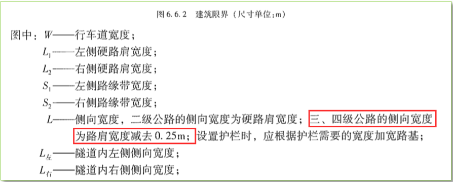 3)对于三、四级公路,当土路肩宽度采用0.5m或者更大值时,L侧向宽度在减去0.25m之后的部分宽度(0.25m),是属于公路建筑限界之内的。这里并不能简单理解为不需要侧向宽度。